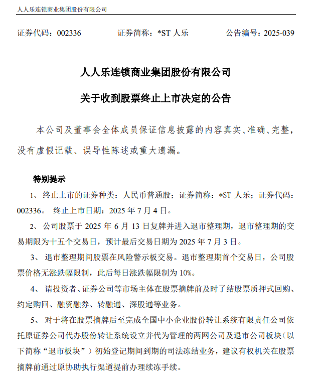 公告显示,*ST人乐股票将于6月13日复牌并进入退市整理期,退市整理期为十五个交易日,预计最后交易日期为7月3日。终止上市日期为7月4日。