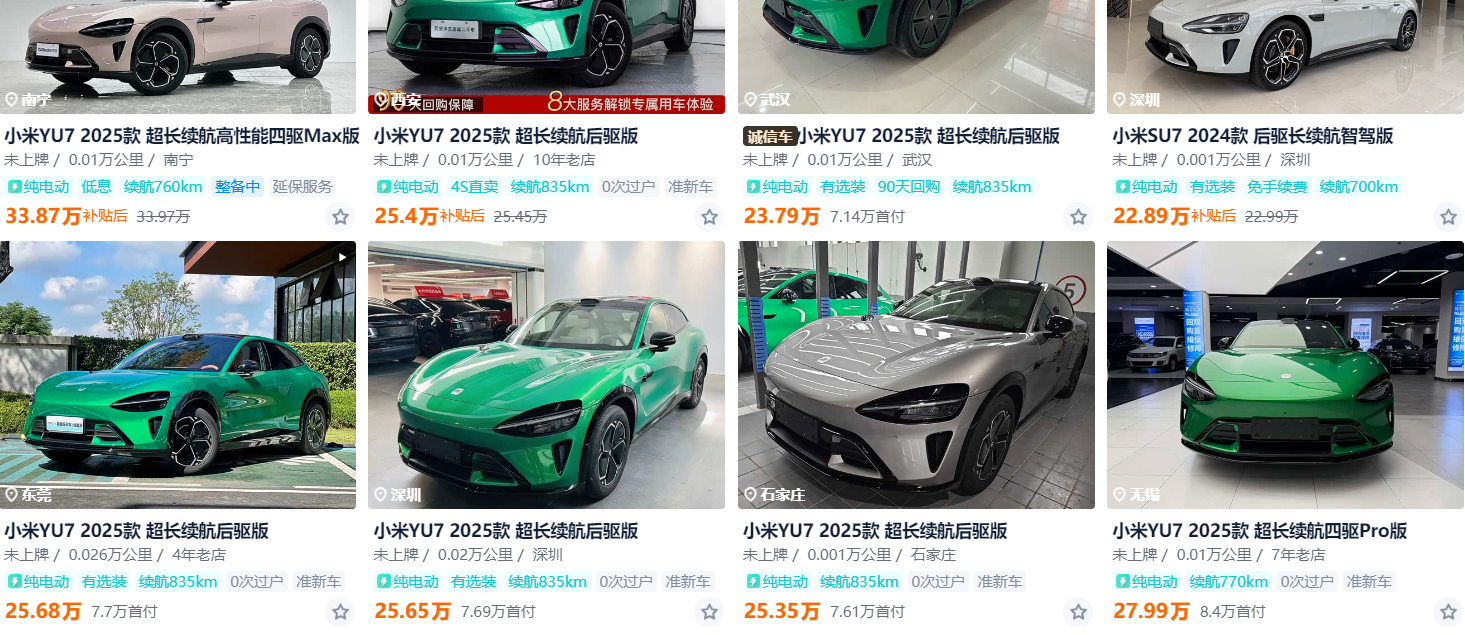 其次,二手车市场的异常现象更值得关注。在二手车之家等平台,大量小米 SU7、YU7 车型以 “零公里二手车” 名义在售,行驶里程多为 0.01 万公里或几百公里,部分车型价格甚至高于官方指导价 ——YU7 2025 款 Pro 版未上牌车型标价 29.66 万,超出官方指导价数万元。这类 “准新车” 本质是行业潜规则的产物:车企或经销商将新车上牌后计入销量,再通过二手车渠道转卖,以此粉饰交付数据、回笼资金。长城汽车董事长魏建军曾揭露,此类卖家在主流二手车平台达三四千家,形成完整的销量造假产业链。小米大量零公里二手车的流通,很难不让人联想到其交付数据可能包含这类 “虚假交付”。