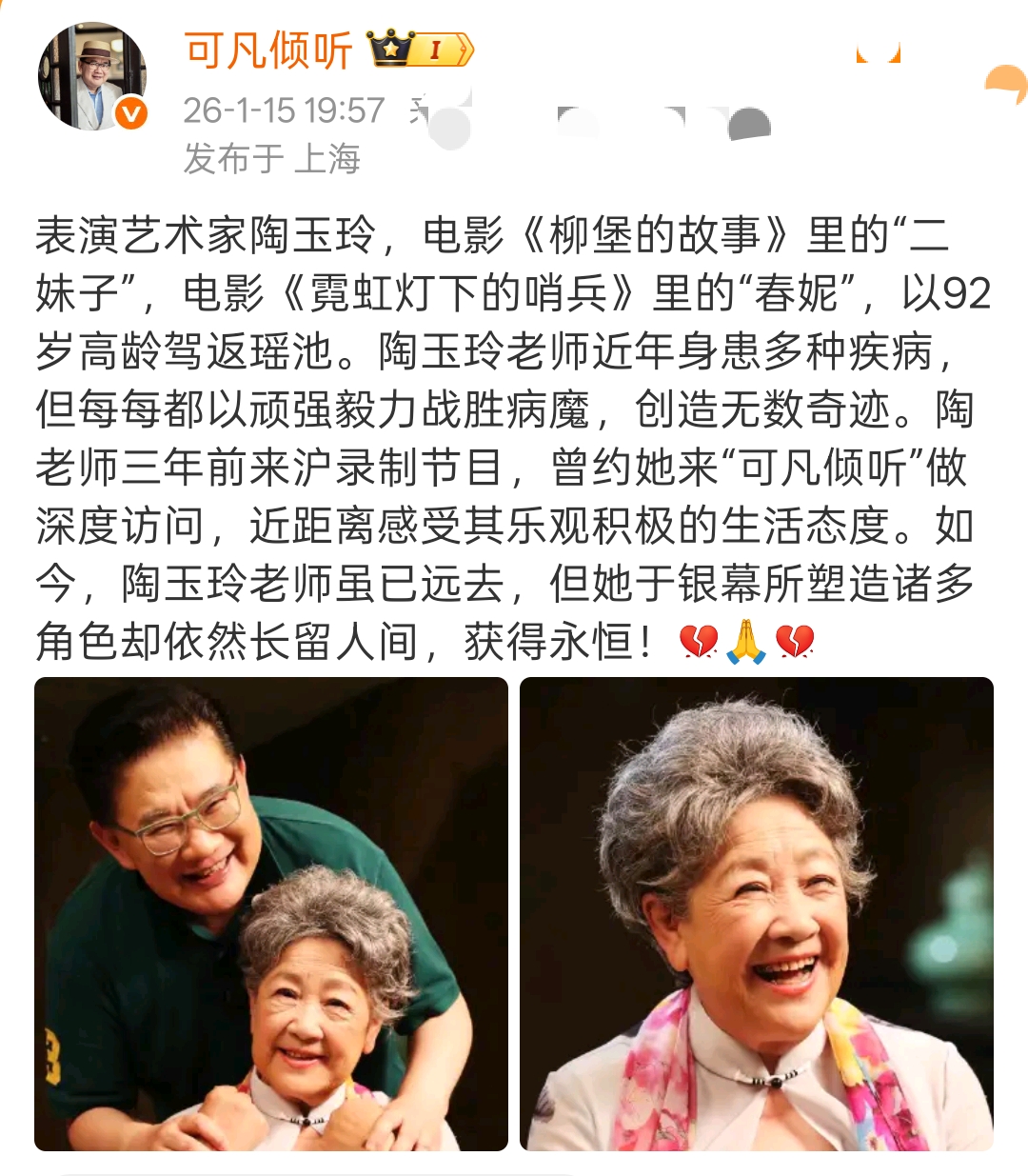 1月15日晚,演员冯远征发文称著名表演艺术家陶玉玲去世,享年92岁。同时,主持人曹可凡也发文确认了这一消息:“陶玉玲老师近年身患多种疾病,但每每都以顽强毅力战胜病魔,创造无数奇迹……如今,陶玉玲老师虽已远去,但她于银幕所塑造的诸多角色却依然长留人间,获得永恒!”
